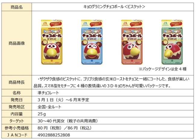 なお、3月1日(火)から期間限定で発売となる「キョログラミングチョコボール<ビスケット>」は、ザクザク食感のビスケットに、ゴリゴリ食感の玄米ローストをチョコと一緒にコーティングした新商品です。新商品「キョログラミングチョコボール<ビスケット>」だけでなく、基幹品の3品もキョログラミングを訴求するパッケージデザインへ3月上旬より順次切り替え予定です。