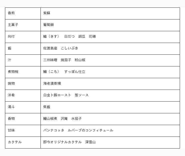 その「即今」の8月のコースメニューは、茶人益田鈍翁が大正3年8月30日、小田原掃雲台の滝の下に涼棚を作って催したとされる会記を元に、即今風に再現したメニューを提供します。大正期の息吹を感じながら、是非ご賞味ください。