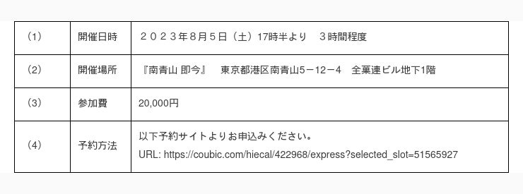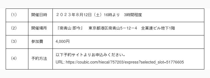 都会の茶室で茶事を愉しむ『南青山 即今』8月は東都茶会記より夏の茶事を再現!8月は茶事を愉しむ3つのイベントを開催。まずは、8月5日(土)17時半より「茶事勉強会夜会」を開催!