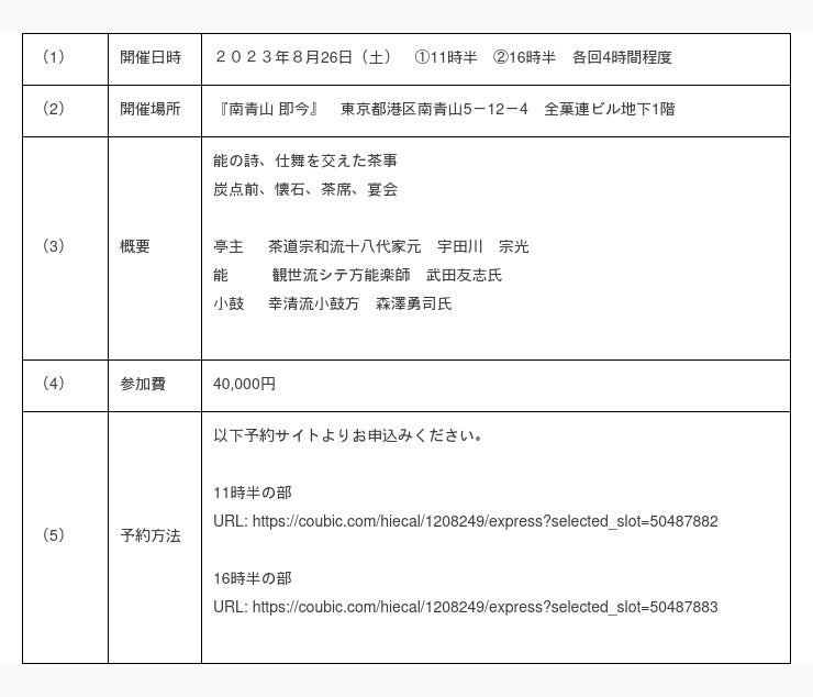 8月26日(土)11時半、16時半より、「南青山即今」にて、観世流シテ方能楽師の武田友志氏と幸清流小鼓方の森澤勇司氏のご協力を頂き、能を趣向とした茶事を開催します。お謡いを交えつつ茶懐石の付いた茶事の後 ささやかな宴席もご用意しております。この機会に、能と茶事を通して日本文化の素晴らしさに触れてみませんか。