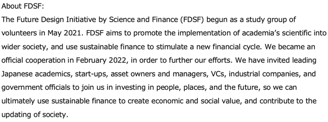 一般社団法人科学と金融による未来創造によるイニシアティブ|Future Design Initiative by Science and Finance (FDSF)は、2021年5月より有志の勉強会から始まりました。アカデミアのサイエンス・ナレッジを社会に実装する取り組みとサステイナブルファイナンスを通じた新しい資金循環の促進を目指し、大学等との連携を通じて必要な科学技術と金融を繋ぐ人材の育成、資金供給の仕組み等について議論してきました。その活動を更に加速化するべく、2022年2月に法人化しました。日本を代表するアカデミア、スタートアップ、アセットオーナー、アセットマネージャー、VC、事業会社、政府関係者の方々に参画いただき、サステイナブルファイナンスによる経済的価値と社会的価値の創出にシームレスに取り組み、社会のアップデートに貢献するための、場づくり・人づくり・未来への投資を実現します。