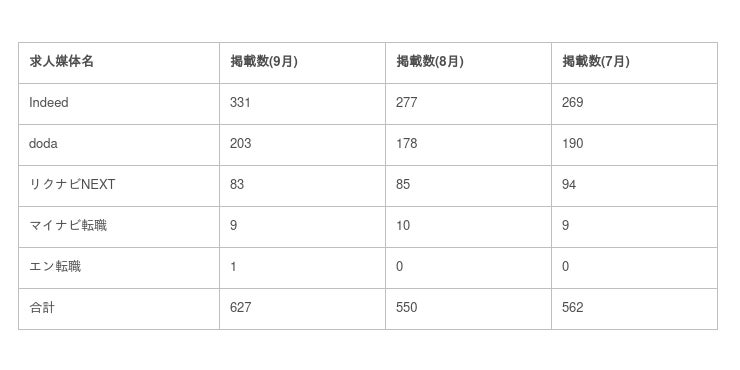 Indeedとdodaでの増加が目立ち、全体の掲載数アップにつながっています。