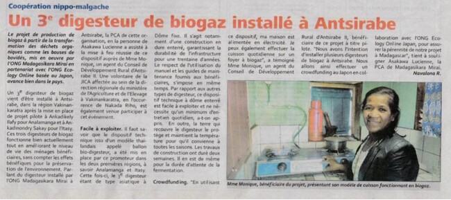 特定非営利活動法人エコロジーオンライン(本部:栃木県佐野市 理事長:上岡裕)は9月20日、クラウドファンディングプロジェクト「牛のうんちがマダガスカルを救う!」をスタートさせました。9月29日現在、目標の70万円の7割にあたる49万円を越える支援が集まり、目標の達成まであと20万円に迫りました。中田里穂隊員の故郷である静岡県富士市付近の方からの支援が圧倒的で静岡とマダガスカルを絆で紡ぐ施設となりそうです。また、マダガスカル第3の都市アンチラベには今後のバイオガス施設建設のためのモデル基が完成しました。9月23日に実施した点火式には多数の関係者が集まり、バイオガスに対する関心の高さがうかがえるイベントとなりました。