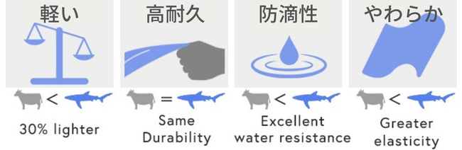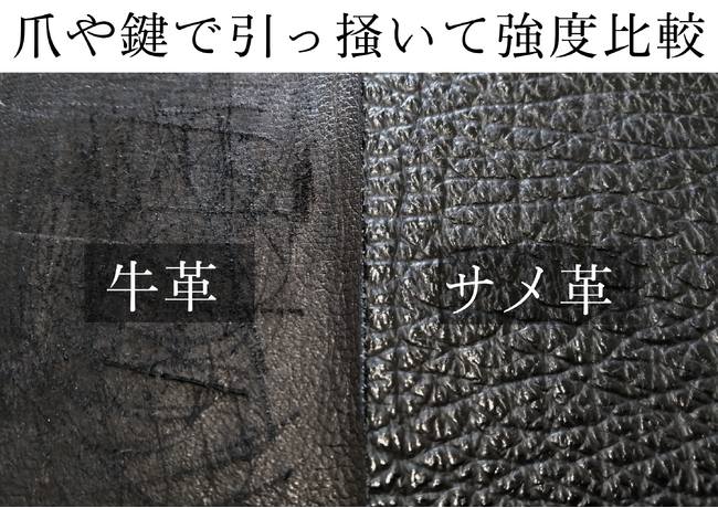 サメ革は、キズや水濡れに強くて丈夫。なのに柔らかくて軽いのが特徴です。