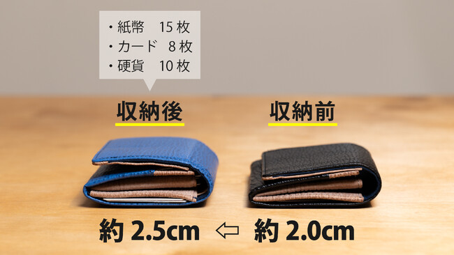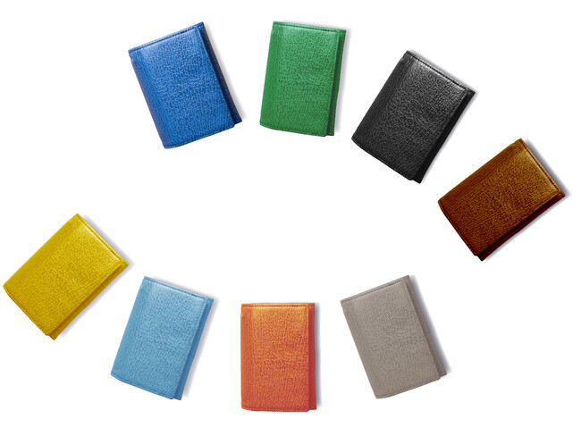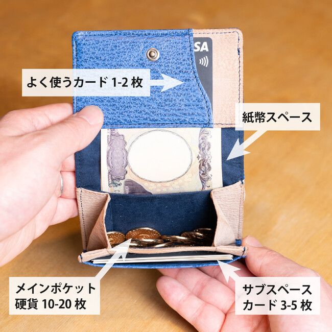 独自の縦型構造で中身のスムーズな出し入れと、大容量な収納力を実現。ミニ財布ながら、カードや硬貨はもちろん、折らずに紙幣、さらに名刺まで入る設計が特徴です。