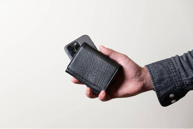 iphone14 Proと比較しても、この通り。片手に収まるスマートさです。さらに、iphone14 Proが重量206gに対して、この財布は約55g。1/4程の重さしかなく、本革の財布としては大変軽く仕上がっています。