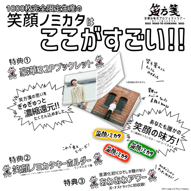 初リリースのCDには笑方箋の楽曲と共に、想いやコンセプトを込めた32ページのブックレットと、仲間の証である『笑顔ノミカタ』キーホルダーを同封。