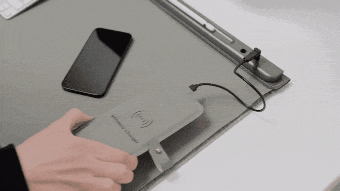 PUレザーマットの左右両側のマグネットに、充電器を固定できます。充電器はQi充電規格なので、iPhoneやAirPodsはもちろん、ほとんどのデバイスに対応しています。充電器は、マットから取り外して持ち運ぶこともできます。