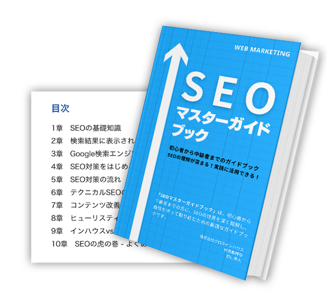 ※2023年7月21日からSEOマスターガイドブックのPDFファイルを配布開始。SEOマスターガイドブックは、SEO初心者から中級者が知っておくべきSEOスキルを全て網羅したデジタルブックです。(161ページ)株式会社クロスインハウス(西山隼人)が、2007年から現在までのSEOノウハウを詰め込んだガイドブックです。