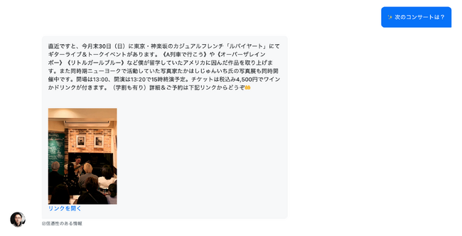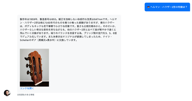 「ファンの方やグラシックギターを嗜まれる方から様々な質問をいただくことはあるが、身一つでは常に受け付けることには限界がある」という想いがあったという村治氏。その『もどかしさ』を原動力に、村治氏ご本人が会話型AIの開発を行いました。