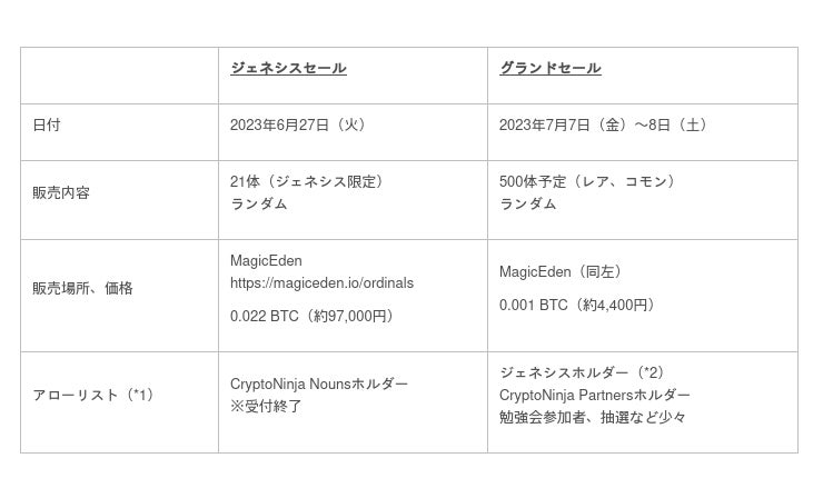 CryptoNinja Ordinals は今後、7月7日に500体のグランドセールを実施します。こちらは 0.001 BTC(約4,400円)と比較的にお求めやすい価格となっています。日本初の大規模ビットコインNFTコレクションとして、国内はもちろんのこと、海外でも通用するコレクションを目指して展開をして参ります。