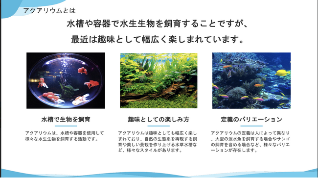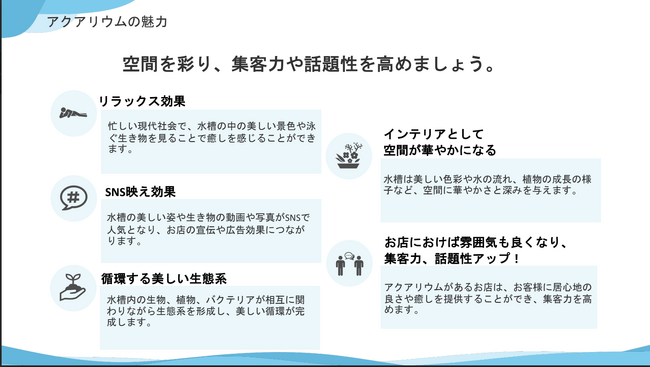 ・事業内容:アクアリスト向けコミュニティサイト「おサカナ図鑑」の運営、カフェとアクアリストのマッチングサービス、アクアリウムを活用したマーケティング支援