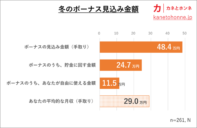 さらにボーナスの使い道を聞いたところ、見込み金額48.4万円に対して、51.4%の24.7万円を貯金すると回答。自由に使える金額は11.5万円とボーナスの23.8%でした。
