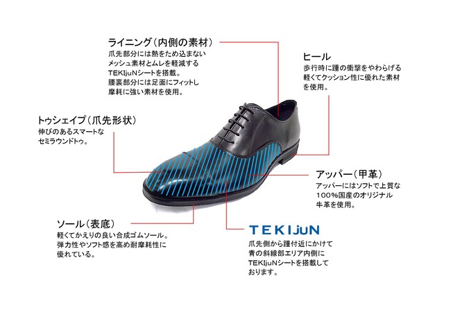 これからの梅雨や夏の季節に「TEKIjuN」素材が内蔵されている革靴は靴の汗、蒸れを吸湿、放湿してくれる特徴があり、1日中歩き回るビジネスマンにもピッタリな快適な革靴です。