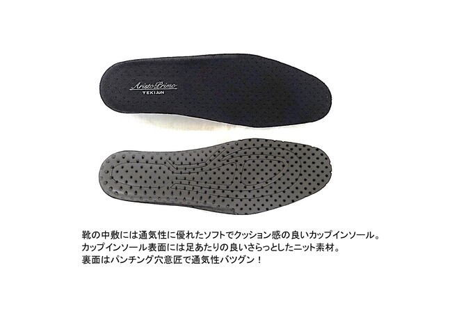最適湿度に調節・維持できる調質素材の「TEKIjuN」を内装に配したドレスタイプ。靴型は伸びのあるスマートなソフトチゼルトゥ。履き心地が良く長時間履いても疲れにくい。先裏・腰裏には通気性の良いニット素材、上質なライニング。軽くて耐摩耗性に優れたアリストプリモオリジナルソール搭載。