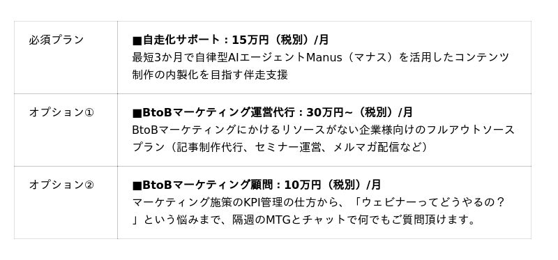 本サービスは、単なるWebサイト制作にとどまらず、AIを活用した「高品質な記事作成ワークフロー」と、HubSpot等のMAツールを見据えた「リード獲得の仕組み」をセットで提供するパッケージです。