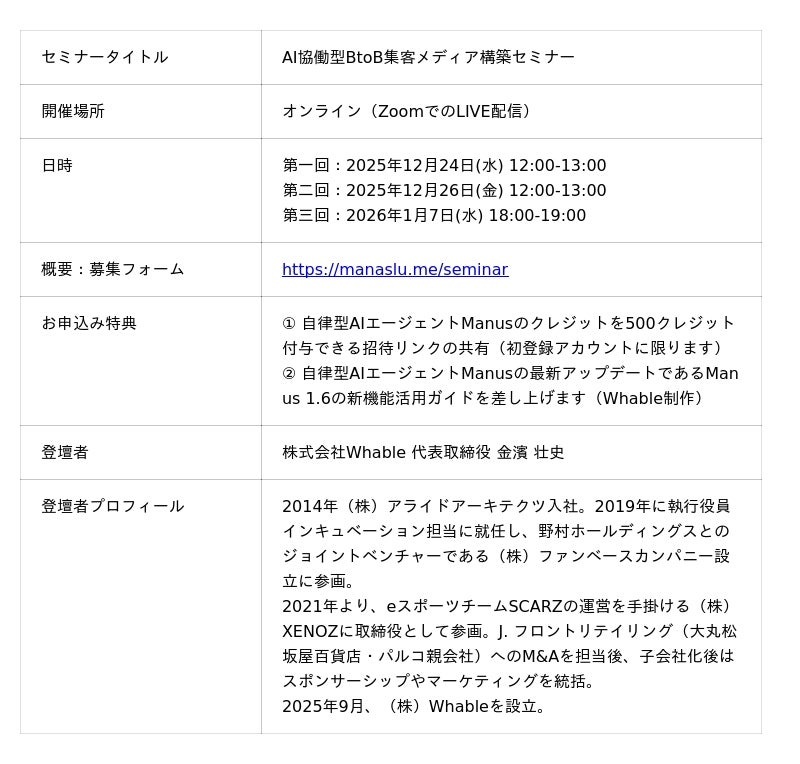 【株式会社Whable(ウェイブル)】自律型AIエージェント「Manus」× ノーコード「Studio」を活用した、"勝手に集客する" オウンドメディア構築・自走化支援サービスを開始