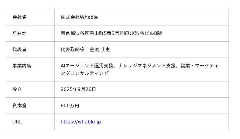 [画像5: https://prcdn.freetls.fastly.net/release_image/171961/3/171961-3-29c2a8ec8d356dedcdb74a578b43a8d6-1200x320.png?width=536&quality=85%2C75&format=jpeg&auto=webp&fit=bounds&bg-color=fff ]株式会社Whable(ウェイブル)は、「人の頑張り」に依存した働き方に限界を感じ、 「成長の踊り場」からの脱却を目指す企業に対して、AIエージェントの導入を支援する会社です。「AIエージェント運用」のコンセプトのもと、AIを社員として迎え入れ、現場での協働を通じて自社のカルチャーや暗黙知を学習させる「AIオンボーディング」を支援します。単なるツールではなく、自社のDNAを持った「頼れるパートナー」へとAIを育て上げることで、人とAIが共に進化する強い組織をつくります。