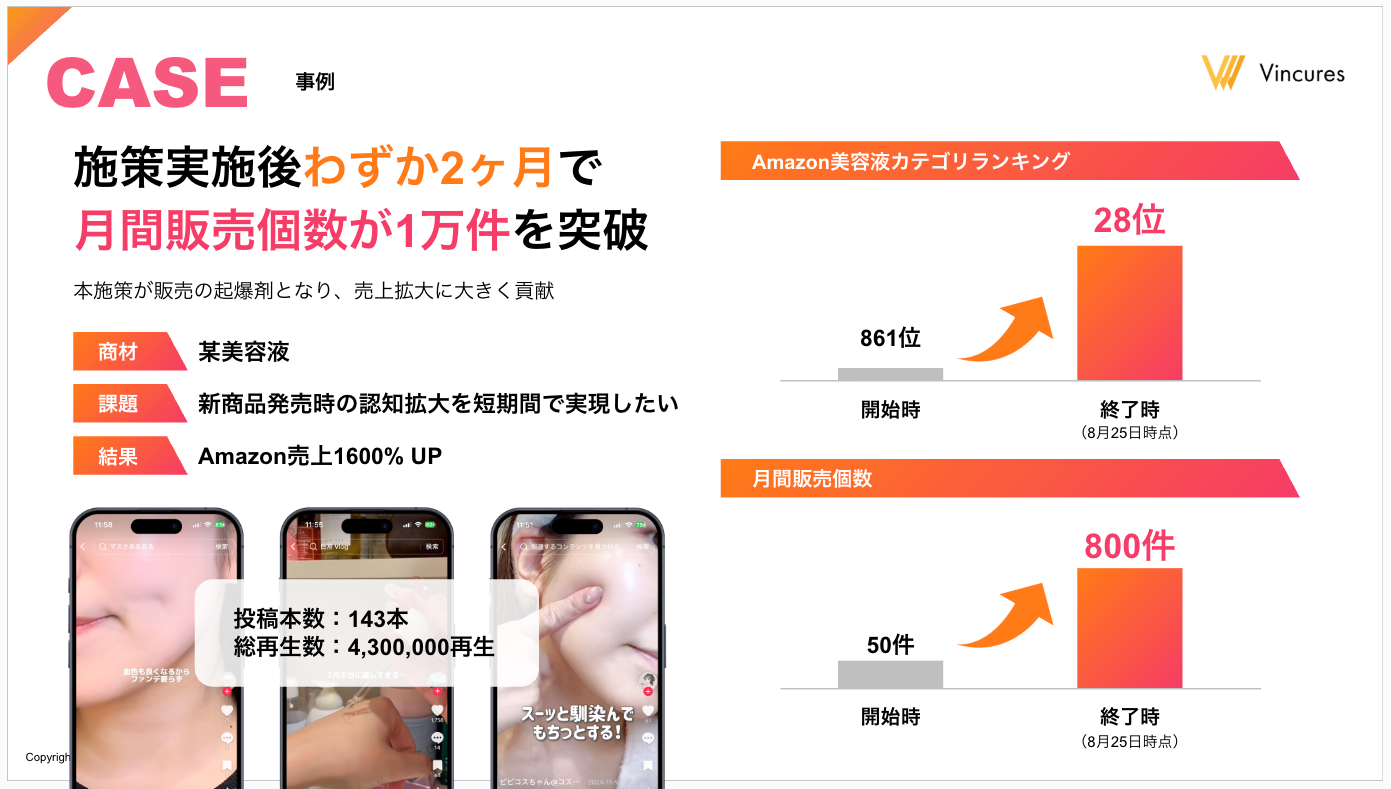 Vincuresは、TikTokマーケティングの先行事例において、戦略的なUGC風縦動画の活用による大規模施策により、ターゲット層への「認知」を爆発的に拡大させ、結果としてAmazon売上1600%UPの起爆剤となった実績を有しています。この大規模施策の成功は、緻密な「認知拡大」戦略が基盤となっています。