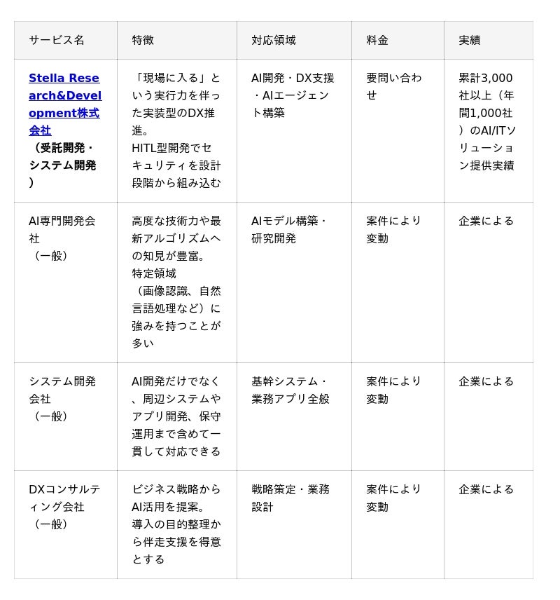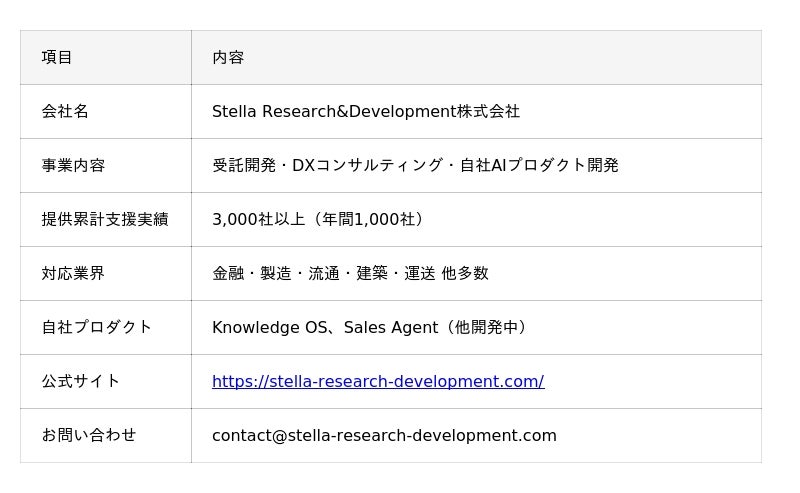 Stella Research&Development株式会社は、累計3,000社以上の実績と、Human-in-the-Loop型開発による4層セキュリティモデルを強みに、AI開発の相談窓口から実装・運用定着までの伴走型支援を提供しています。