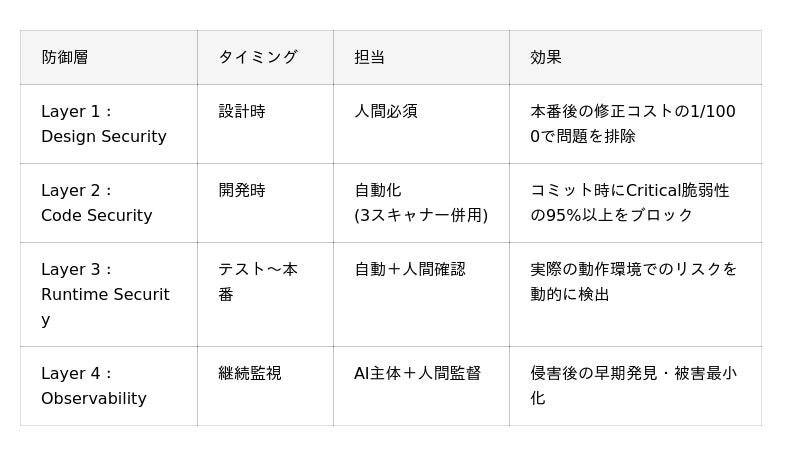 重要な原則: セキュリティゲートをCI/CDパイプラインに組み込み、Critical脆弱性が存在する限り本番デプロイができない仕組みを設計しています。