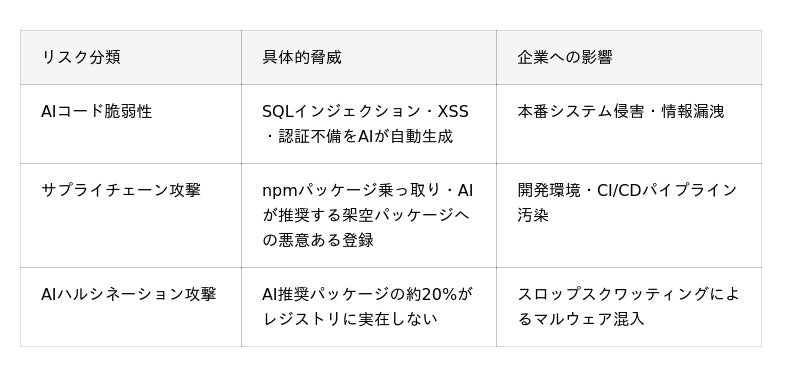 依頼先のセキュリティ体制が脆弱であれば、AI生成コードの脆弱性がそのまま本番環境に流出し、情報漏洩や事業停止といった経営リスクに直結します。
