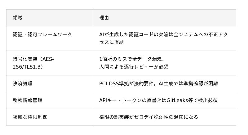 以下の5領域はAI生成コードの脆弱性リスクが最も高く、人間のエンジニアが実装する必要があります。