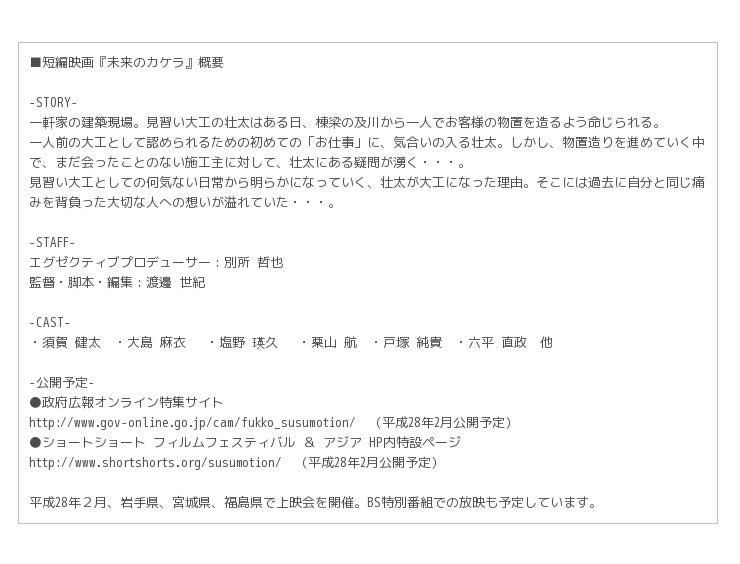 本作文募集は、平成27年7月からスタートした『未来へススモーション!! 新しい東北』キャンペーンの一環として展開され、子どもたちの未来に向けた元気な姿を描いた作文を募集、最優秀作品を原作にした短編映画を制作、発信することで、未来を感じる気持ちを共有し、「自ら進む」原動力へとつなげていくことを目指して展開されました。