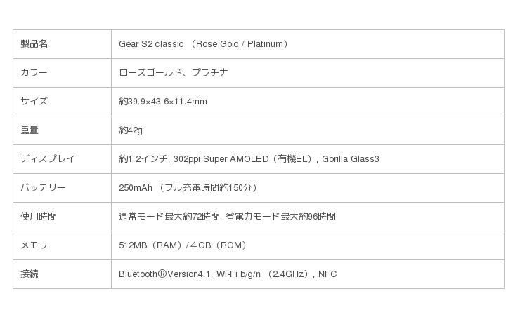 今回の新製品は、2015年12月18日に発売された2つの腕時計型ウェアラブル端末「Gear S2」、「Gear S2 classic」のうち、「Gear S2 classic」の新色として発売されます。ローズゴールドは18金が使用されたベゼルとアイボリーの本革レザーバンド、プラチナはプラチナ100%が使用されたシルバー調のボディとブラックの本革レザーがそれぞれ採用され、高級感のある外観となっています。