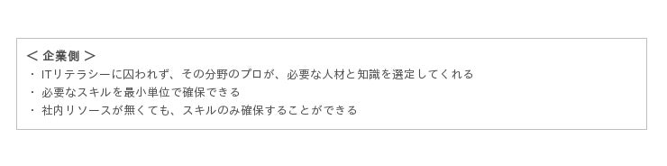 仕事を依頼する側としては、正社員採用や派遣等のエージェントに左右されず、ノウハウや人的リソースを必要な時に必要な分だけ確保できる画期的な仕組みとなっています。