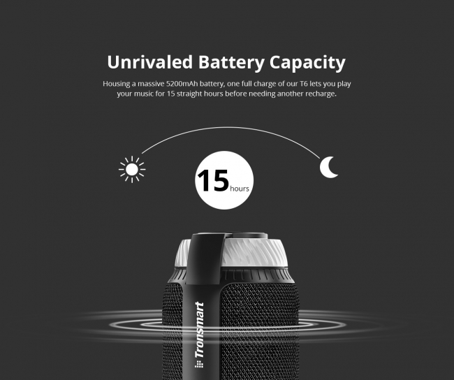 T6には5,200mAhの大容量バッテリーを搭載。省電力性に優れたBluetooth4.1と合わせて、なんと15時間もの長時間の連続再生に対応。朝から晩まで再生し続けることが可能で、自宅でも出先でも快適なリスニングが可能です。