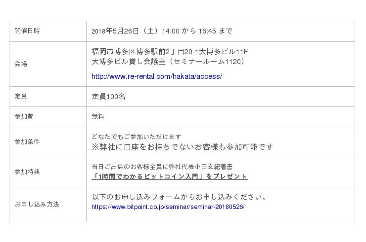 株式会社リミックスポイント(証券コード:3825、本社:東京都港区六本木3丁目2番1号、代表取締役社長 小田玄紀)の子会社である株式会社ビットポイントジャパン(以下「BITPoint」)は、2018年5月26日(土)に、福岡県・博多において初心者の皆様に向けたセミナーを開催いたします。