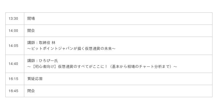 セミナーでは、仮想通貨の投資情報としてコラムを執筆いただいているひろぴー氏による「仮想通貨の基本から、チャート分析を用いた取引まで」、および取締役の林による「ビットポイントジャパンが描く仮想通貨の未来」の2部構成を予定しております。セミナーへのご参加は無料となっておりますので、奮ってお申し込みください。
