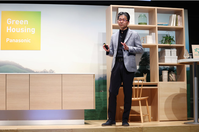 会の始め、MCの呼び込みとともに、4月から、パナソニック ハウジングソリューションズ株式会社代表取締役 社長執行役員に就任する山田 昌司が登壇。「目指すのは、ひとりひとりにいいくらしが、環境にもいいくらしであること。“Green”のもつ「環境」「調和」「向上」というイメージに、“Housing”を組み合わせた、「Green Housing」のスローガンのもと、パナソニック ハウジングソリューションズ株式会社は、人と環境の両方から、くらしを変えていきます」と新会社発足に向けての抱負とスローガンを力強く宣言いたしました。
