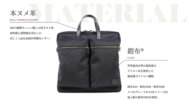 本体素材には世界最高水準の耐久性を誇る鎧布(R)(GAIFU)を使用。