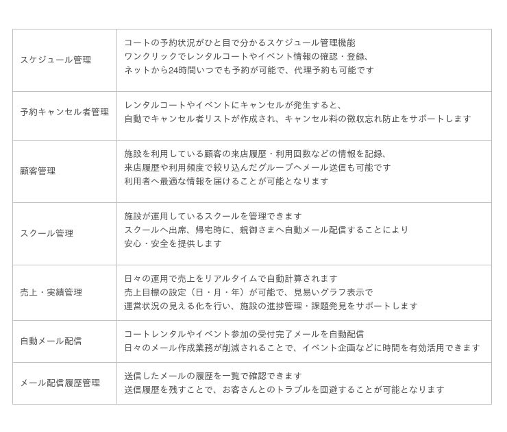 コート予約や顧客・イベント管理・スクールや売上管理機能など、施設を一元管理できる機能を提供することで、複雑な管理業務を簡略化し本来の業務である「利用者にスポーツをより楽しんでもらう」活動に集中できる環境創りをサポートするサービスです。