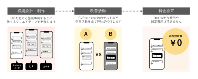 また、その実装にあたってはカートシステム側に開発を施す必要はなく、「タグ設置のみ」でその環境を実現し、A/Bテストを含む改善活動も全て弊社にお任せいただけます。