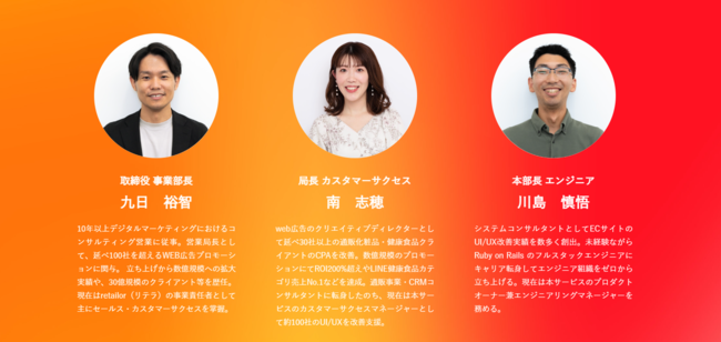 「retailor(リテラ)」は、「広告代理店独自のクリエイティブノウハウ」×「担当コンサルタントの手厚いサポート」によって、実店舗に近いリアルな接客体験を実現します。入力フォームだけでなく、クッションページやLP、オフラインメディアからの流入もチャット化することができ、統一された購入体験をお客様にご提供します。(https://re-tailor.jp/)