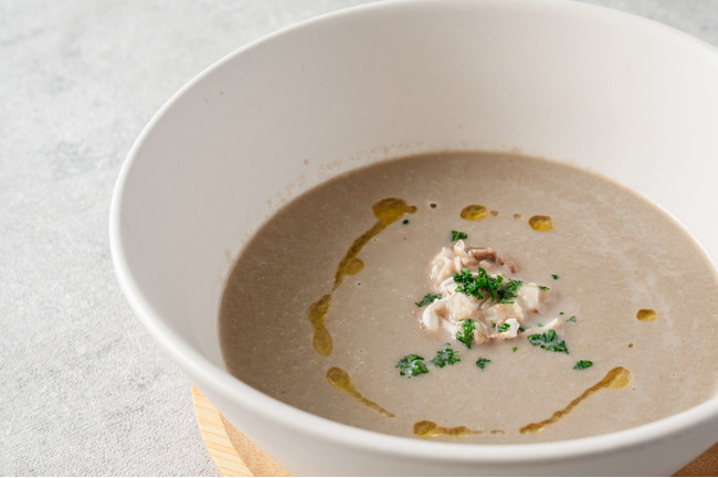 オーガニックオーツミルクの香ばしくコクのある甘味に、マッシュルームの濃厚なうま味をあわせた奥深いスープです。最後に自家製のマッシュルームオイルをかけて、風味をプラス。