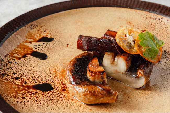 滋味深い牛蒡(ごぼう)をバルサミコソースと赤ワインでエチュベ(焼き蒸し)し、熟成したマッシュルームのオーブン焼きとあわせました。優美な甘味と香りの金柑のスライスを添えて。