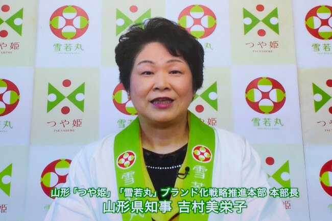第一部・山形のお米「雪若丸」新米発表会の冒頭では、山形「つや姫」「雪若丸」ブランド化戦略推進本部・本部長を務める、山形県の吉村美栄子知事によるビデオメッセージが放映されました。吉村知事は記録的猛暑となった今夏を振り返り、米の栽培管理が難しい中でも善戦した雪若丸について「今年も全国の皆さまにおいしい新米をお届けできることを大変うれしく思っております」と喜びのコメント。米どころ・山形県の存在感を一層高めてほしいと、今年の新米への期待感を語りました。続いて、山形県農業協同組合中央会・折原会長が新米の一等米比率の高さに触れながら「大変優秀な品種であることの証明」と述べ、これからも「全国の皆さまに愛されるお米に」なるよう、挨拶しました。