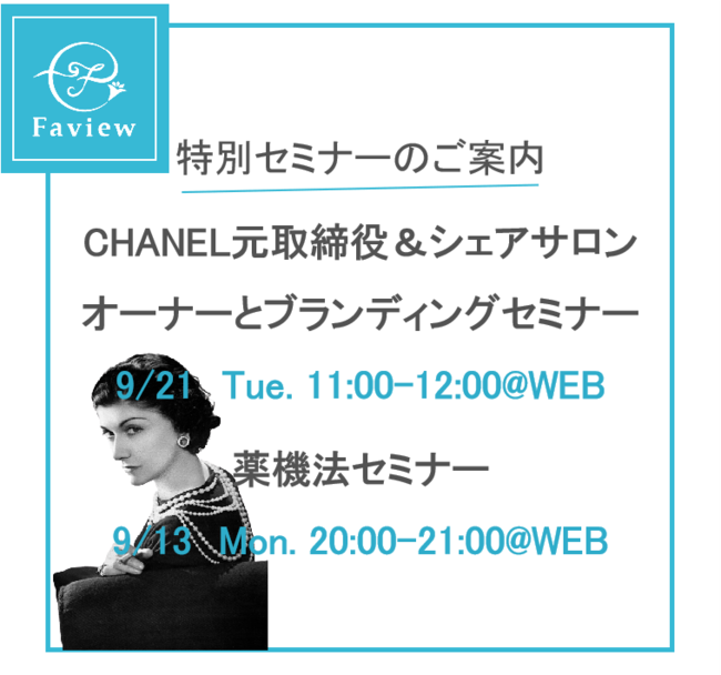 9月は薬機法セミナーとともに元CHANEL取締役、美容室オーナーの2名をお迎えしてハイブランドのブランディングについてお話いたします。