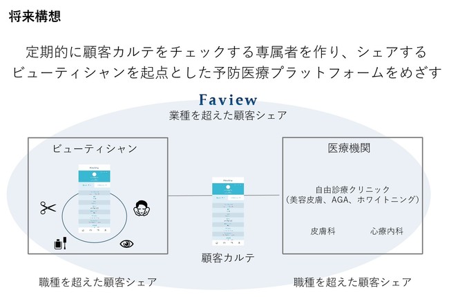 また、カルテ内容をもとにFaviewを通じて美容業界と医療業界(皮膚科、心療内科、自由診療)をつなげていくことにより美容サロンが予防医療の起点になる世界をつくっていきます。