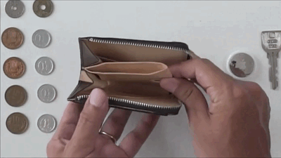 紙幣10枚、小銭15枚、カード8枚、鍵、スマートタグ、領収書が収納可能。