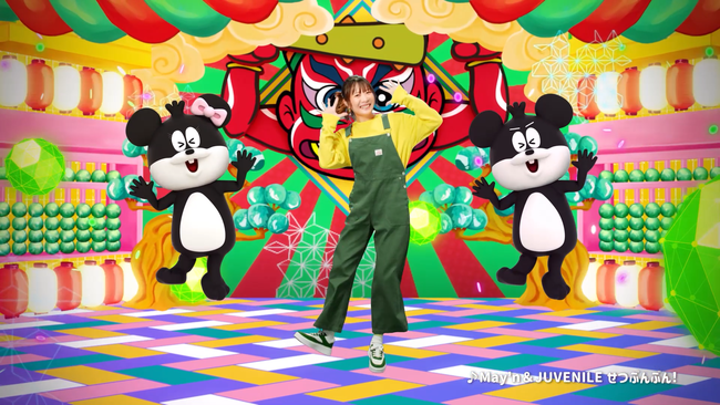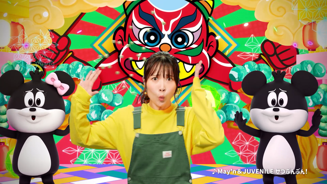 子どもさん向け番組のセットのようなステージでMay'nさんが作詞し、JUVENILEさんが作曲・編曲した「せつぶんぶん!」に合わせて、でん六のキャラクター「でんちゃん」「でんこちゃん」がMay'nさんが考えた振付で一緒に楽しく歌って踊って豆まきをして、節分を盛り上げます。3人のバックには今年のでん六節分キャラクター鬼の「シン・カブキ鬼」が厄除け・無病息災のご利益を与えるべく鎮座しています。