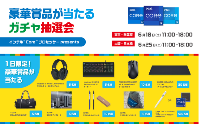 2022年6月18日(土) に東京・秋葉原、6月25日(土) に大阪・日本橋にて、ゲーミングデバイスやインテル・オリジナル・グッズが当たる各会場1日限定のガチャ抽選会を実施いたします。