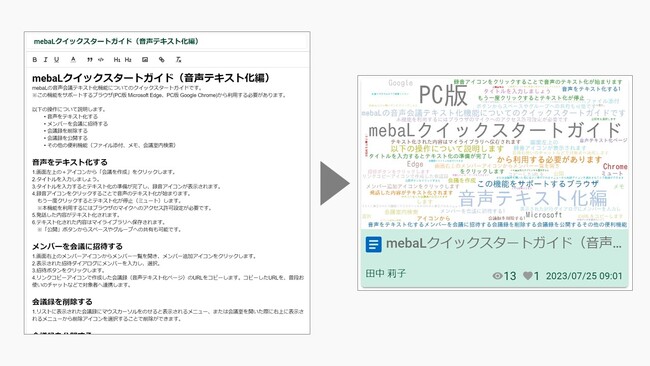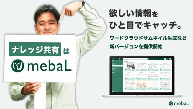 株式会社K-BIT(本社:大阪市中央区、東京都品川区 代表取締役社長 前垣内徹)は、2023年7月、当社が開発・提供を行っているナレッジ共有サービスmebaL(メバエル)において、文章からイメージ化されたワードクラウド画像を用いたサムネイル表示機能などを追加した新バージョンをリリースいたしました。