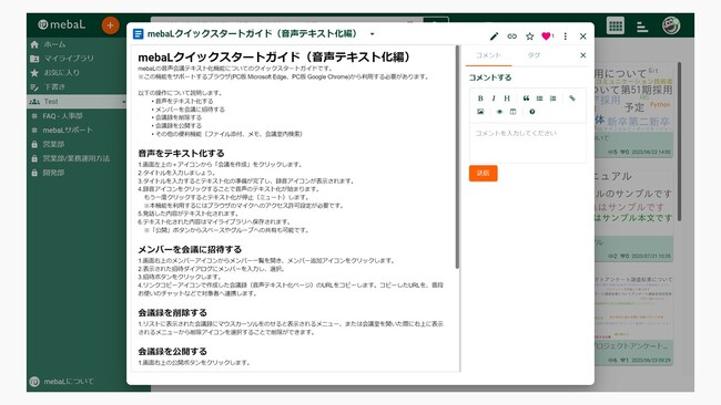 mebaL(https://mebal.jp/)は、個人の業務ノウハウやアイディアを組織内に蓄積・共有するためのナレッジ共有クラウドサービスです。社内の「あの人にしかわからない」という状況をなくし、誰もがいつでも得たい情報へ簡単にアクセスできる環境を実現することで、業務効率の最大化をサポートします。