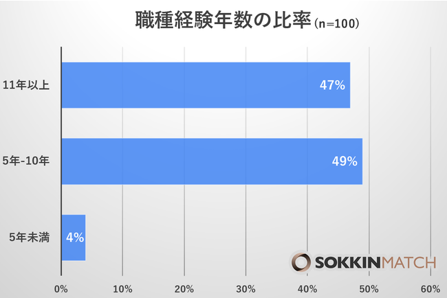 本調査は「SOKKIN MATCH」サービスプラットフォーム内の実際に登録のあるユーザーより、2023年2月28日現在より直近100名の登録者情報を元に男女比率、年齢比率、登録職種、経験年数を調査しました。マーケターの登録が多く、47%が職種経験年数11年以上と経験豊富な人材の登録が多いことがわかりました。