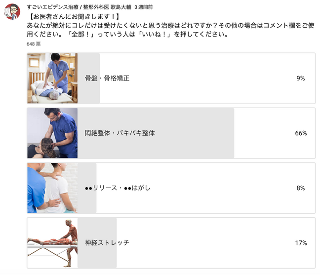整形外科専門医であり情報発信ドクターとしても知られる歌島大輔が運営するYouTubeチャンネル「すごいエビデンス治療 | 整形外科医 歌島大輔」にて、【お医者さんにお聞きします!】という前置きで、アンケートを実施しました。質問は「あなたが絶対にコレだけは受けたくないと思う治療はどれですか?」というものであり、その回答は興味深いものでした。